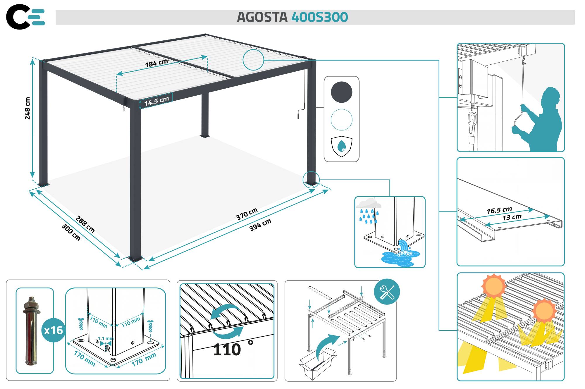 La pérgola bioclimática autoportante AGOSTA combina un diseño contemporáneo con una funcionalidad óptima para realzar su espacio exterior. Su robusta estructura de aluminio, junto con lamas ajustables de acero galvanizado con un ángulo de 0 a 110°, le permite controlar la entrada de luz solar y la ventilación según sus necesidades. Gracias a sus lamas blancas que contrastan con la estructura gris antracita, esta pérgola ofrece un aspecto luminoso y elegante, a la vez que mantiene un estilo moderno y refinado.